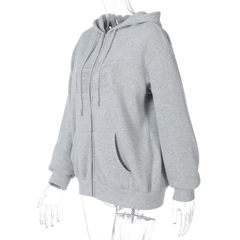 2021 Spring New Fashion Zipper Cardigan Letter Rhinestone Coat Velvet Padded Hooded Sweatshirt Women