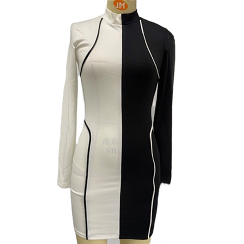 Autumn and Winter New Stitching Contrasting Color Thread round Neck Slim Fit Pullover Dress Women Clothing