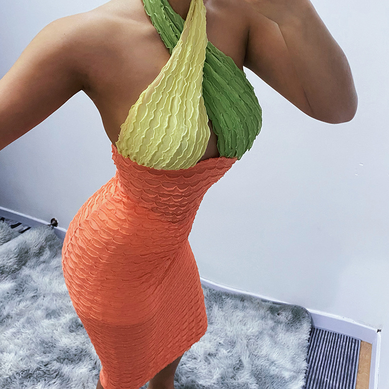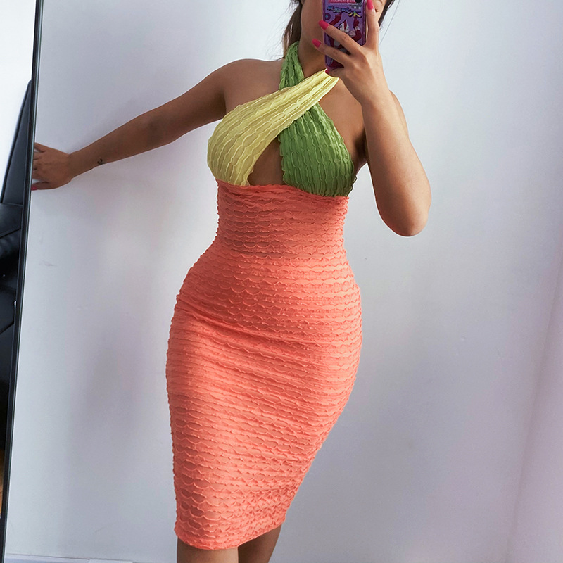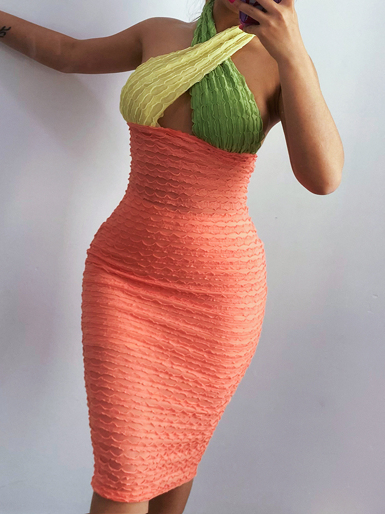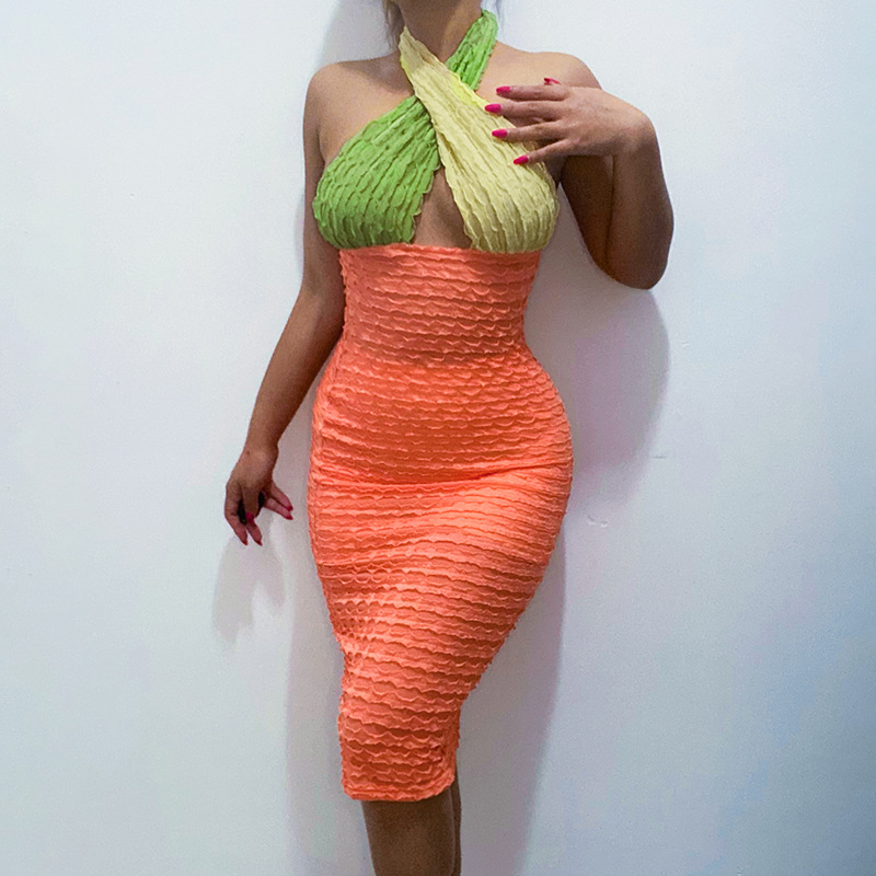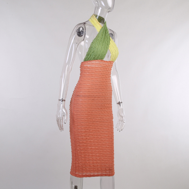 Color Matching Backless Cross Long Dress Women 2021 Summer Sexy Color Hip Skirt