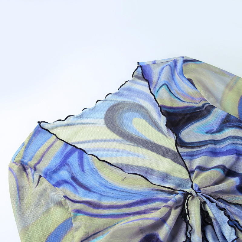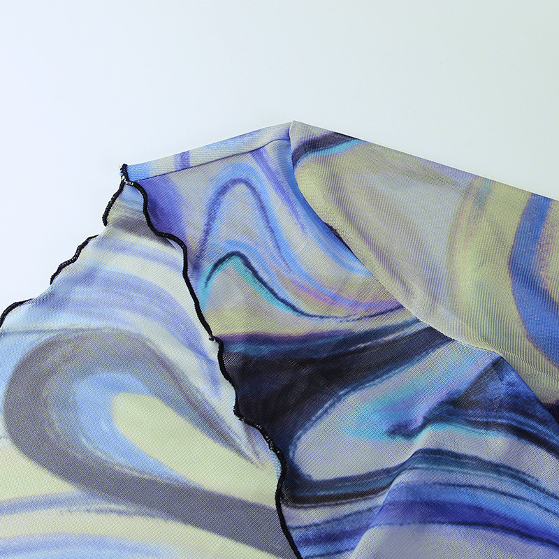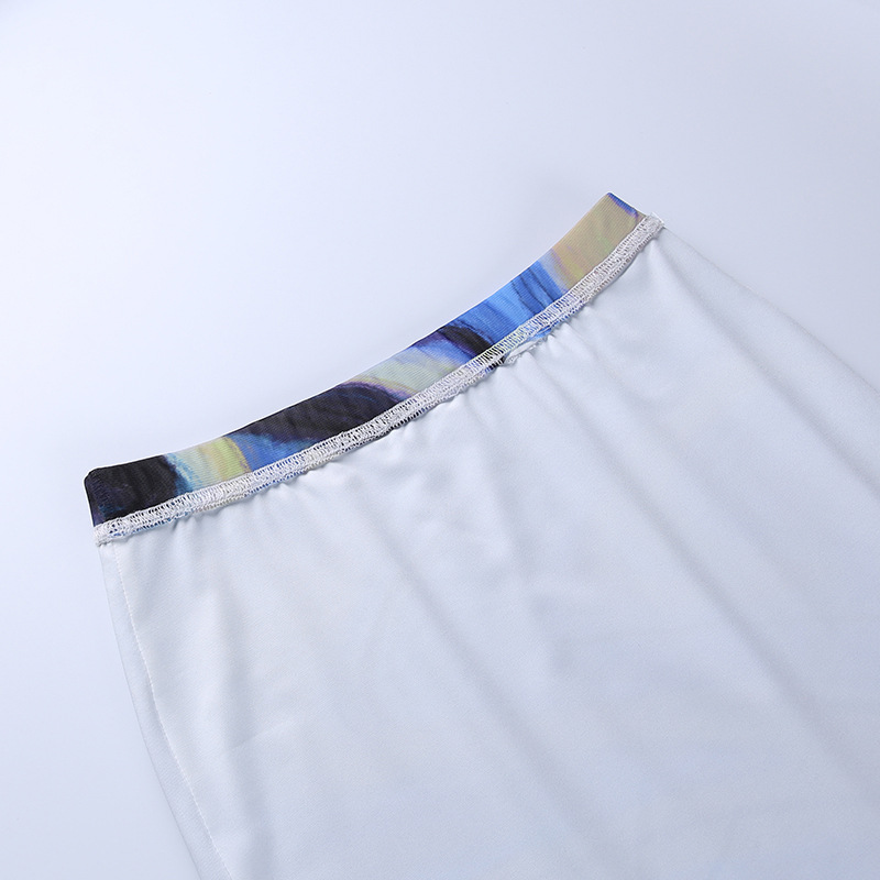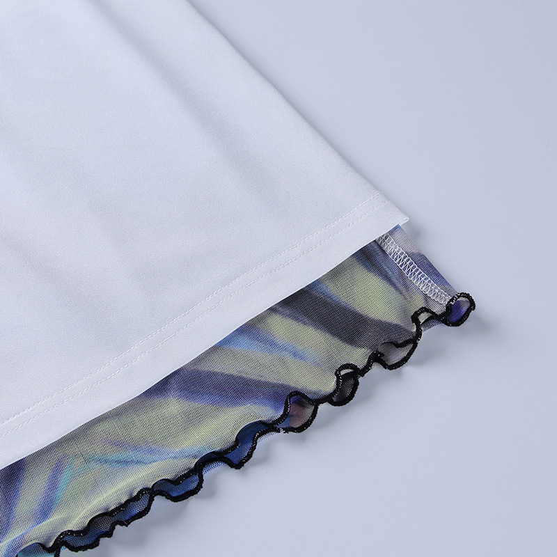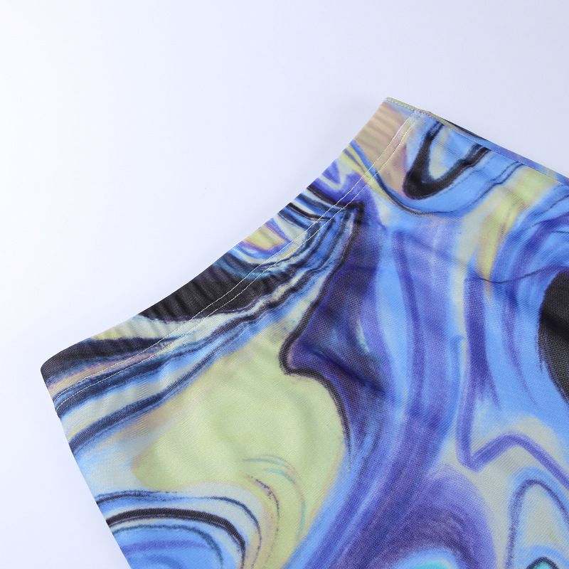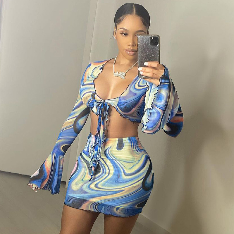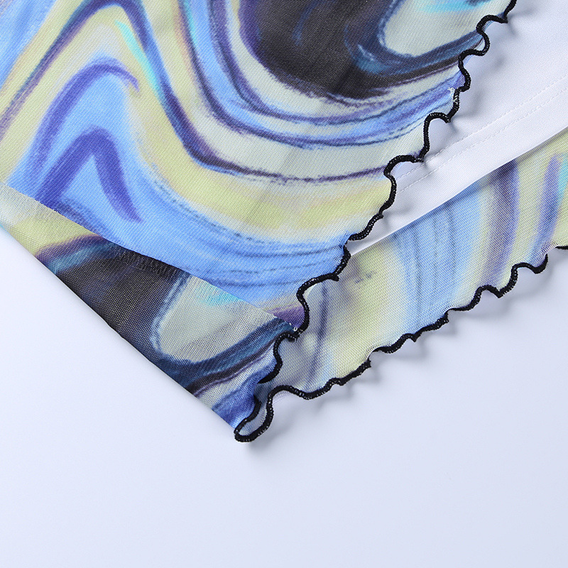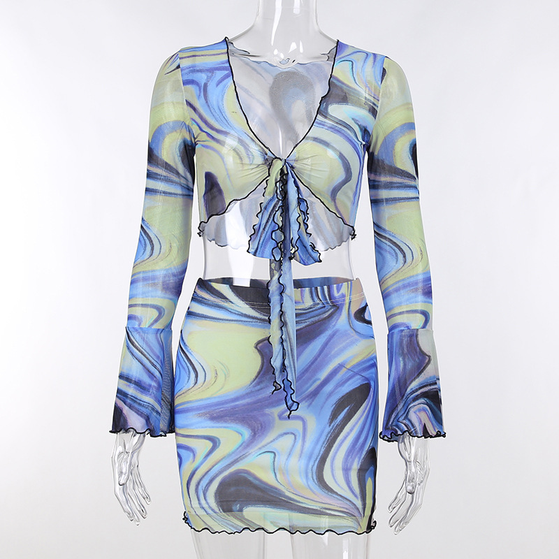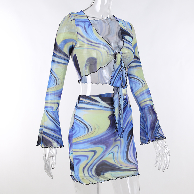 Fashion Casual Women Clothing New Color Pattern Printed Mesh Lace up Slim Fit Show Chest Skirt Suit