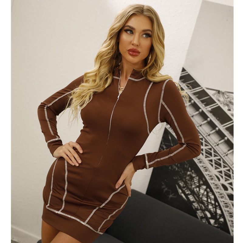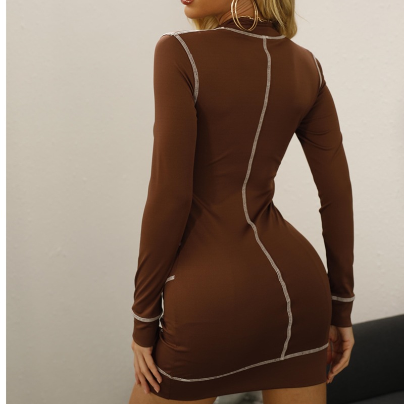 New Patchwork Lines Contrast Color Waist-Controlled Long Sleeves Zipper Cardigan V-neck High Waist Slimming Dress for Women