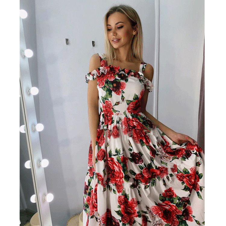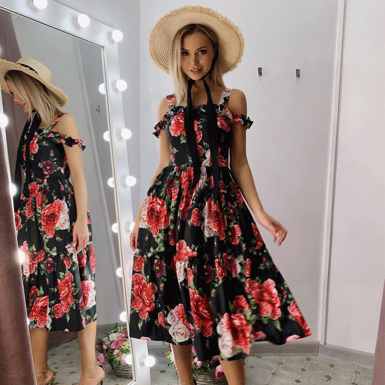 New Summer Fashion Print off-the-Shoulder Strap Style a Swing Women Dress