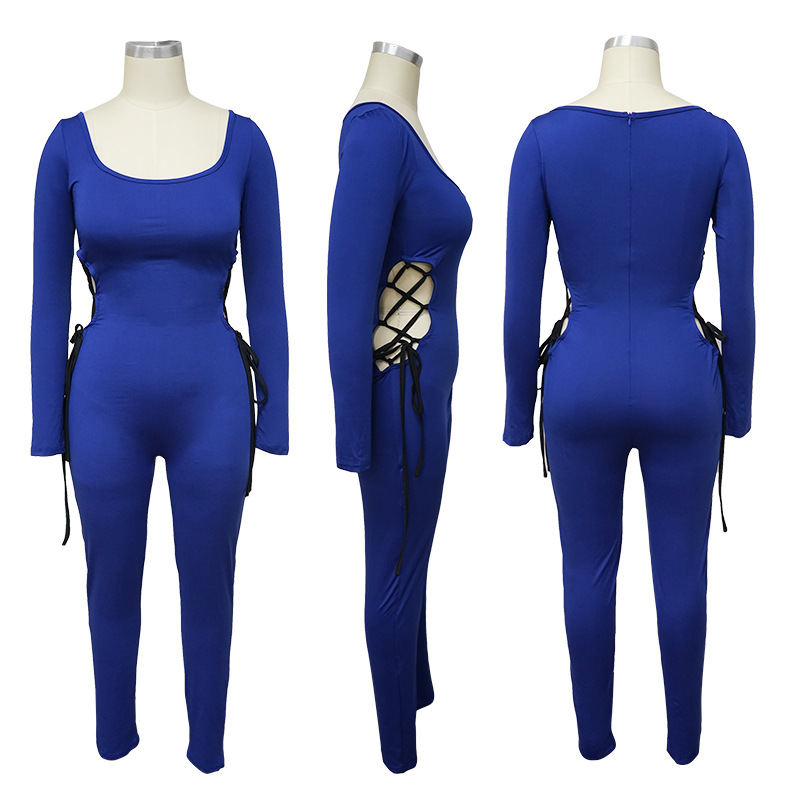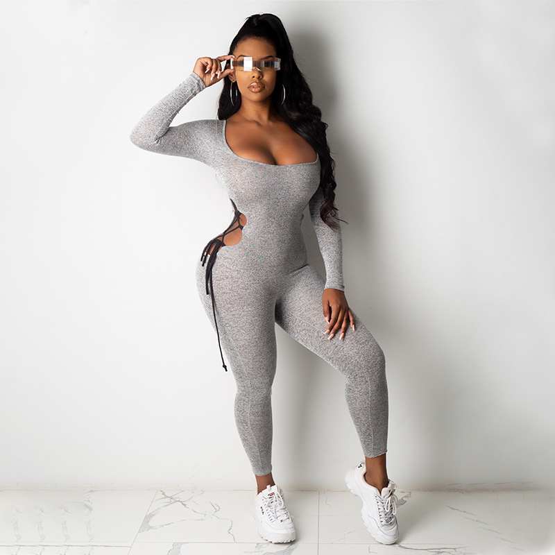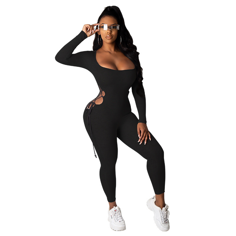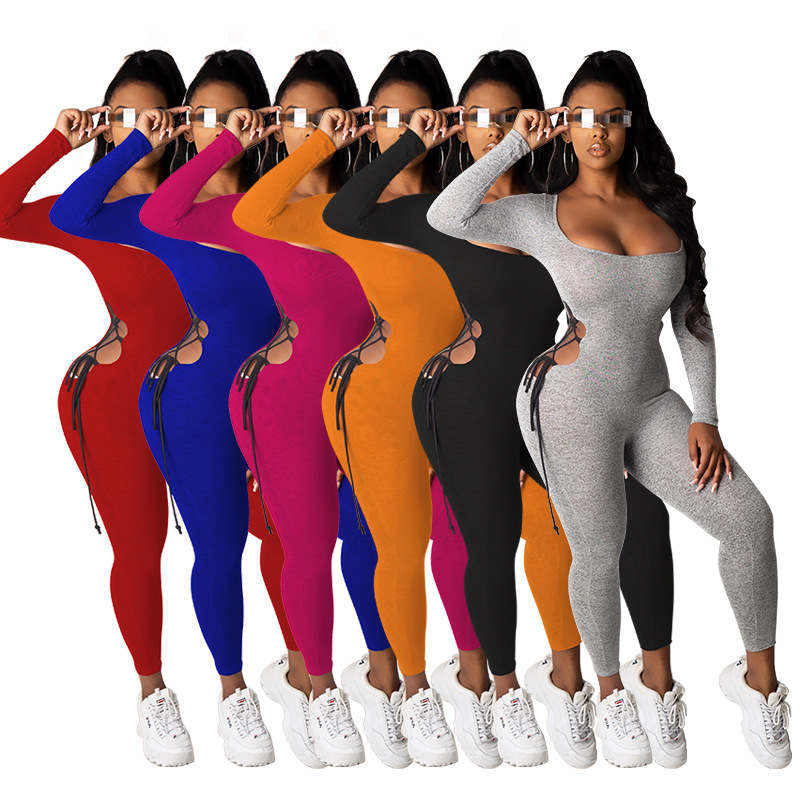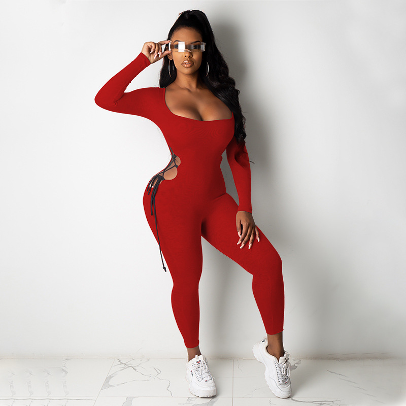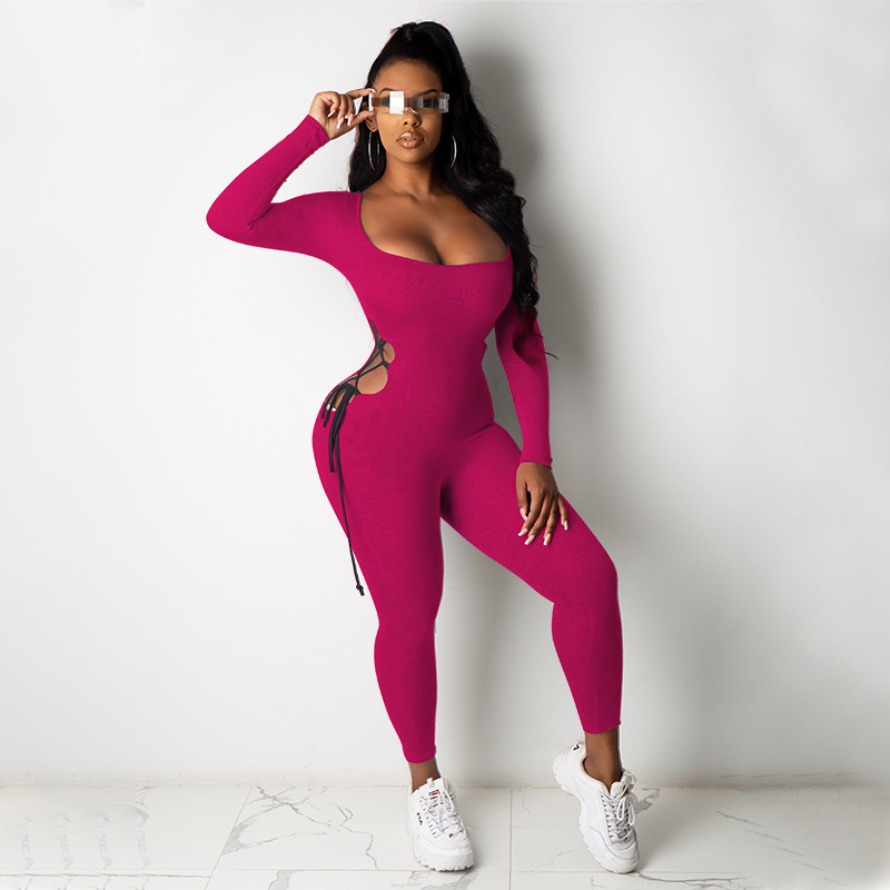 Solid Color Jumpsuit Sexy Lace-up Contrast Color Long Sleeves Tights for Women