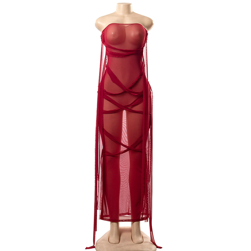 Women Clothing 2021 Spring New Solid Color Tassel Wrapped Chest Mesh See-through Drawstring Long Dress